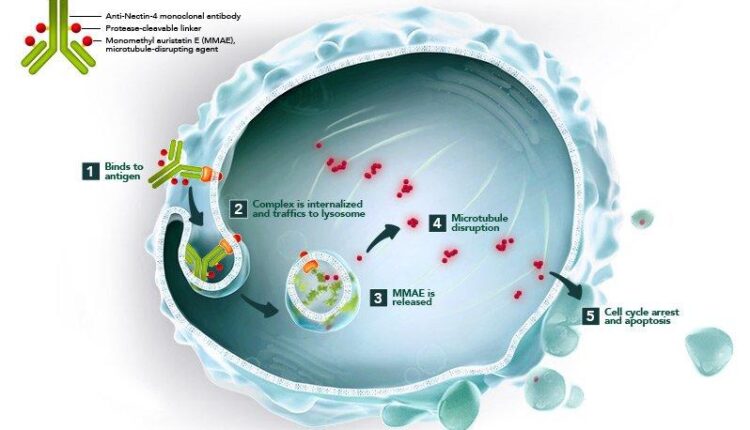 Bu kompleks kanser hücrelerine bağlanıyor ve kemoterapinin hücre içinde salınmasına neden oluyor. Böylelikle kanser hücreleri normal hücrelere göre daha çok kemoterapi etkisinde kalıyor ve yok olması sağlanıyor. Enfortumab vedotin ve pembrolizumab kombinasyonu böbrek fonksiyonu bozuk olan, karaciğer ve kemik metastazı olan kötü seyreden hastalarda aynı zamanda kemoterapiye göre etkili olduğu saptandı.Bu seçenek evre IV mesane kanseri için büyük umut.